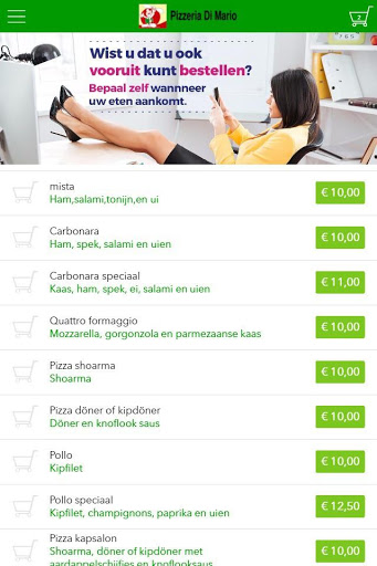 De Di Mario app is gemaakt om gemakkelijker en sneller een bestelling te kunnen plaatsen door middel van een simpele menukaart. In de menukaart kunt u onder andere kiezen voor populaire gerechten, maar u kunt ook zelf ook een menu opstellen.