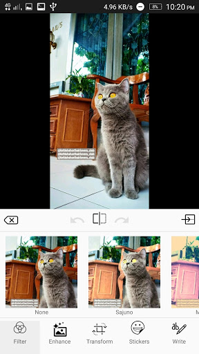 *Filters - Sajuno, Manglow, Palacia, Anax, Sepia, Cyano, B/W, Ansel, Grain, Hist Equal, Threshold, Negative, Green boost, Boost red, Blue boost, Colour enhance, Cyanisation, Fade, Cartoonify, Pencil sketch, Violet tone.