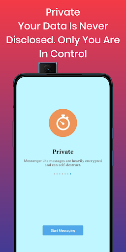 For those interested in maximum privacy Messenger Lite offers Secret Chats. Secret Chat messages can be programmed to self-destruct automatically from both participating devices. This way you can send all types of disappearing content messages, photos, videos, and even files. Secret Chats use end-to-end encryption to ensure that a message can only be read by its intended recipient only.