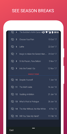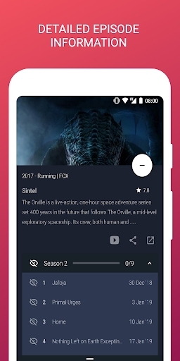 Panduan Episod juga menyenaraikan semua musim masa depan dan masa lalu dan episod TV untuk sebarang rancangan TV dalam pangkalan data TVMAZE dan membolehkan anda mengesan episod yang anda tonton dan kemudian memaparkan kemajuan anda dalam UI yang bagus dan hanya. Panduan Episod membolehkan anda menandakan seluruh musim seperti yang ditonton tetapi tidak akan secara automatik menandakan episod yang unaired.