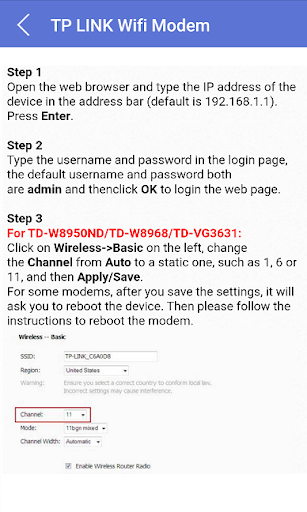 Dalam aplikasi mudah alih kami, anda akan belajar cara menukar saluran wifi modem wifi anda. Anda mungkin perlu menukar saluran wifi secara manual apabila anda menghadapi gangguan isyarat wifi. Bagaimana untuk melakukannya mengikut jenama modem anda dijelaskan dalam aplikasi mudah alih kami.