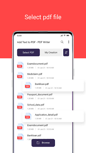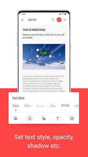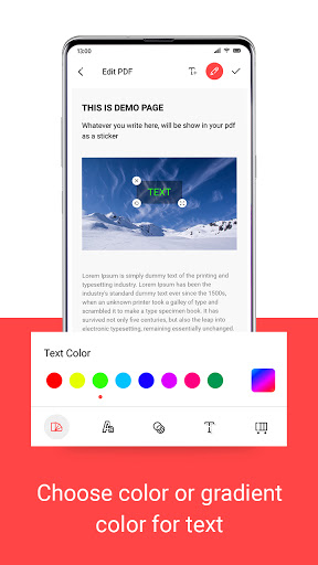 Tambah teks ke PDF - PDF Writer App akan membantu anda untuk menambah teks pada fail PDF.Anda boleh menambah teks dengan warna yang berbeza, gaya teks, menukar kelegapan, warna bayangan dan menukar kecerunan teks.
