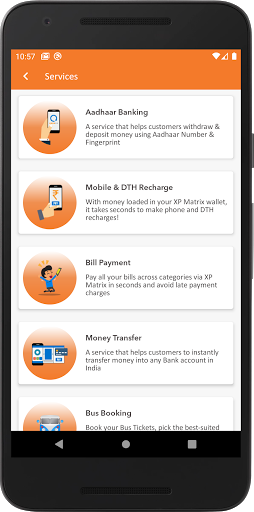 · Download the XP Matrix app now and start Domestic Money Transfer Bus Booking, Insurance, Mobile & DTH Recharge, Bill Payments, & financial services like Aadhaar ATM, perform at your retail Outlet