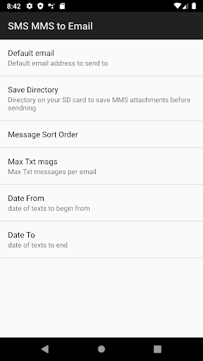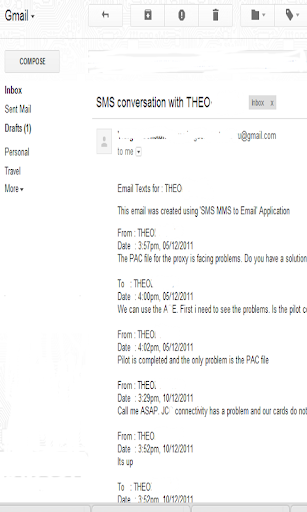 Pilih salah satu perbualan SMS anda atau salah satu lampiran MMS anda dan hantar melalui e-mel ke akaun e-mel anda atau ke mana-mana akaun e-mel lain.Aplikasi ini tidak menyokong penghantaran automatik SMS atau MMS ke e-mel.Pemajuan ke akaun e-mel mesti dilakukan secara manual.
