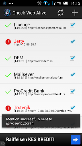 Check Web Alive is a URL monitoring service that checks your URL's at regular intervals and notifies you via push notification, email or tweet mentions by @CheckWebAlive, when your page is not alive.