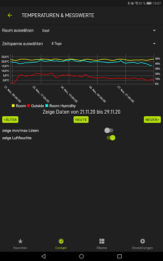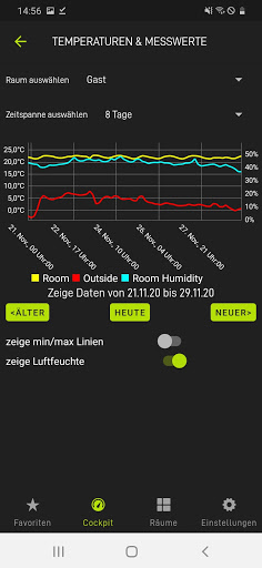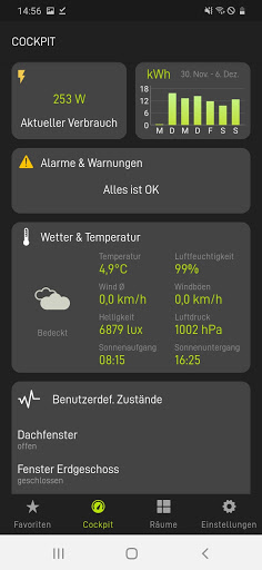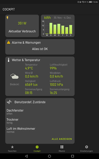 Kegemaran: Senario yang paling penting dari seluruh apartmen dipaparkan di kegemaran.Dan anda boleh menambah kegemaran peribadi anda.Ini boleh menjadi senario dari bilik, peranti individu atau tindakan tersuai.Dalam pandangan terperinci mengenai penggunaan tenaga, litar individu dipaparkan dengan yang kedua.Butiran data iklim menunjukkan nilai kelembapan suhu dan udara dari beberapa hari dan minggu yang lalu.