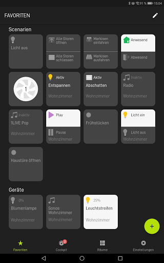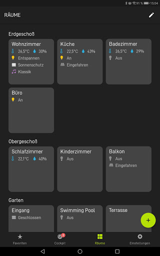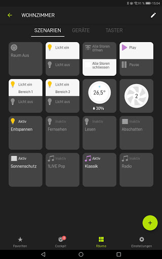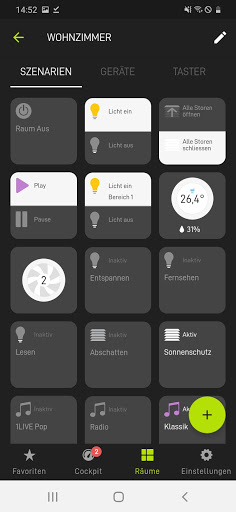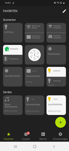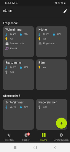 Simpan semua bilik rumah pintar semasa digital anda dengan nilai yang diukur yang berbeza (mis. Suhu atau kelembapan) dan keadaan senario semasa dan semua peranti untuk "cahaya" dan " teduhan ".Setiap perubahan dipaparkan secara langsung dalam aplikasi.