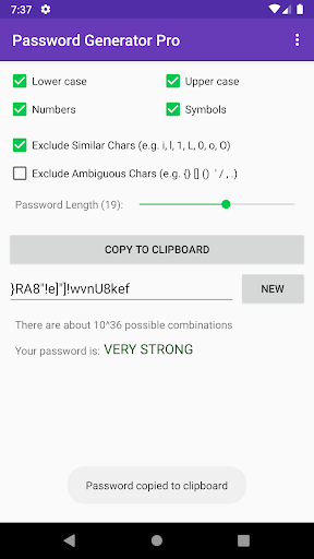 With this app you can generate secure passwords without much effort. You have the possibility to specify from which characters your password should be composed. Generating passwords with Password Generator Pro is fast and easy!