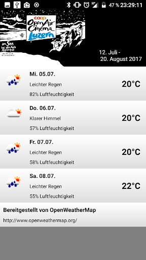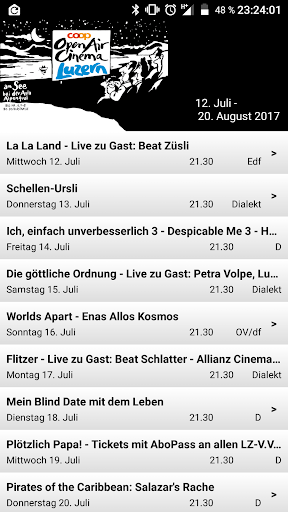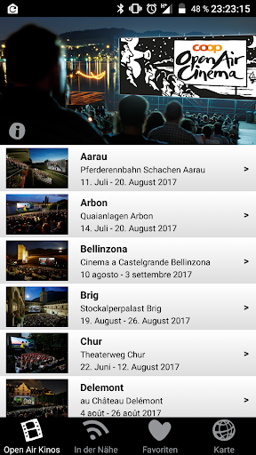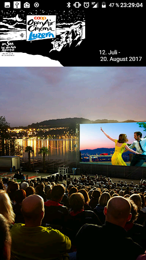 Zwischen Arbon und Vevey, zwischen Delémont und Lugano – präsentieren wir Ihnen Emotionen pur. In attraktiver Umgebung, unter dem sternenklaren Himmel tummeln sich die Stars der Filmwelt auf Grossleinwand. Mit der Open Air Kino Android App haben Sie über 600 Kino-Events, quer durch die Schweiz, überall und jederzeit im Griff. Entdecken Sie das aktuelle Filmprogramm, Detail-Infos für jedes Kino, Favoritenliste, Movie-Trailer, das aktuelle Wetter vor Ort, Situationspläne, Facebook Funktion und noch vieles mehr.