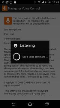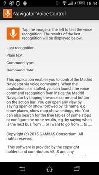 This application enables you to control the Madrid Navigator (version 1.6 and higher) through the power of your voice. Once you install the application a new voice control action will become visible in the Madrid Navigator that enables you to navigate to any screen with a single command. In addition, you can ask for time tables and plan routes to a small set of frequently used stops. Note that the speech recognition is currently limited to English.