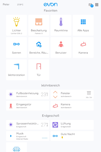 Kami melihat Smart Home sebagai cabaran yang perlu melaksanakan dua tugas: Smart Home harus menjadikan hidup anda lebih mudah dan rumah pintar tidak boleh memaksa.Kami mencapai kedua -dua gabungan perkakasan moden, terbukti dan aplikasi kami, yang membolehkan anda menyesuaikan rumah anda dengan hasrat anda tanpa pengaturcaraan.Di samping itu, lampu yang sangat berbeza dan kesan pencahayaan melalui adegan boleh dibuat dengan mudah dalam aplikasi.Sebagai tambahan kepada kawalan manual yang mudah untuk tirai, ia juga mungkin dengan Evon Smart Home untuk mengawal tirai secara automatik bergantung pada matahari terbenam. Kelembapan.Evon Smart Home menambah maklumat ini kepada nilai amaran debunga semasa di rantau anda.