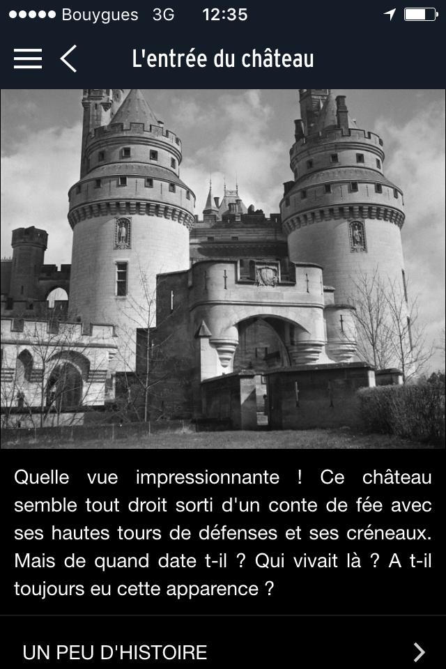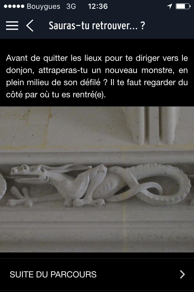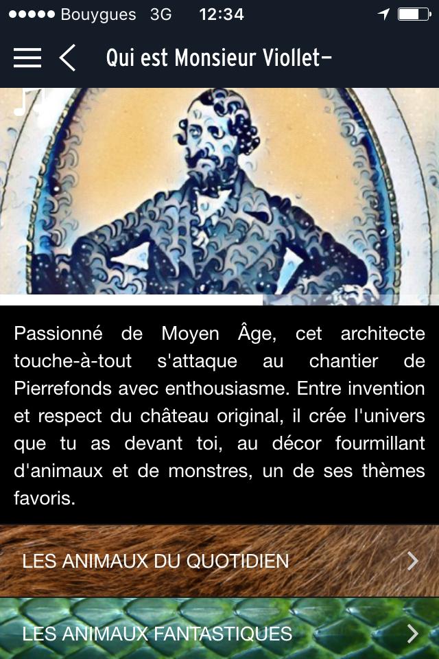 L’application « La Ménagerie fantastique de Monsieur Viollet-le-Duc » est proposée aux visiteurs du château de Pierrefonds et s’adresse en priorité au public jeune et au public famille. Elle permet de découvrir salle par salle l’histoire du château de Pierrefonds, de ses origines médiévales à sa reconstruction au XIXe siècle. Et surtout, elle offre aux utilisateurs la possibilité de partir à la chasse de l’extraordinaire faune dissimulée parmi le décor sculpté, peint ou forgé de l’édifice. Pour ce faire, la rubrique « Sauras-tu retrouver… ? » fera chercher aux visiteurs quelques créatures sélectionnées, au gré des différents espaces traversés. L’application présente également au visiteur la personnalité d’Eugène Viollet-le-Duc, l’architecte ayant reconstruit le château au XIXe siècle et imaginé la majorité des représentations animales du site. Un petit personnage dessiné à son effigie accompagne ainsi le visiteur le long de sa visite, apparaissant sur plusieurs vues. A quatre reprises, l’application a recours à un lecteur de QR code pour des petits bonus audio !