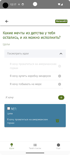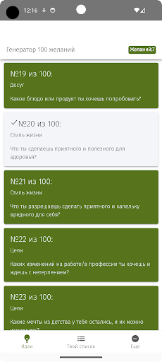 Muat turun aplikasi ini dan lengkapkan & quot; 100 keinginan & quot;.Penyusunan senarai 100 atau lebih keinginan adalah latihan psikologi, dengan bantuan yang anda akan menentukan keinginan, keutamaan dan matlamat anda.Latihan ini boleh dilakukan untuk Tahun Baru, untuk ulang tahun atau pada hari biasa.