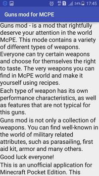 Guns mod - is a mod that rightfully deserve your attention in the world McPE. This mode contains a variety of different types of weapons. Everyone can try certain weapons and choose for themselves the right to taste. The very weapons you can find in McPE world and make it yourself using recipes.