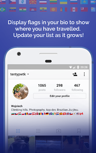 Aplikasi berguna ini akan membantu anda menjejaki semua negara yang pernah anda lawati.Dengan semua bendera emoji, anda boleh menjadikan profil Instagram anda menonjol dari orang ramai.Tunjukkan minat anda untuk melancong, buat profil anda istimewa!