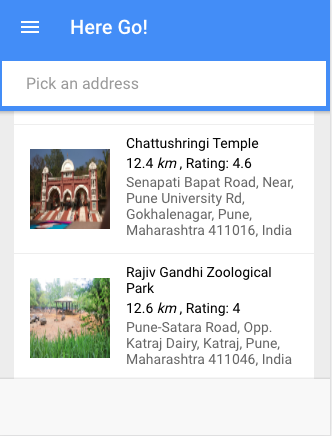 Here Go app search the attraction in the city as input provided in the search bar. It also displays the distance and rating of the places listed in the google place api. The target users who planned to go for vacation and unable to find the best places to go, here the app will come into picture and will guid the user to plan their vacation and places to visit. This is Beta released which only list the attraction, our plan to expand it more which can also provide the nearBy stay ad etc.