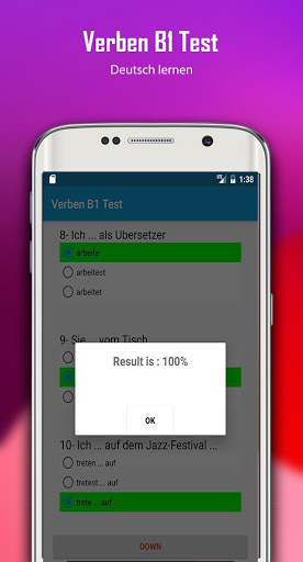 Aplikasi ini adalah rangkaian kalimat Jerman dan tujuannya adalah untuk memilih jawapan yang betul hingga 100% total