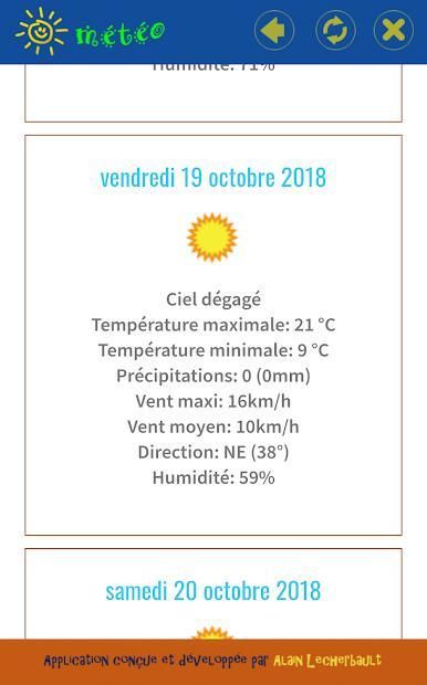 Application météo donnant en temps réel une brève météo selon votre localisation géographique. Exemple ci-après pour Paris le 17/10/2018 à 15h00: