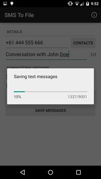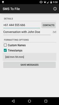 SMS To File allows you to save SMS conversations with your contacts as a .txt file. The logs are saved to a folder ("SMSToFile") on your SD card / external storage, for convenient access so you can export it to your computer later. Messages are presented in an easy to read format, with the option for timestamps for each message, and custom names for the people in the conversation.