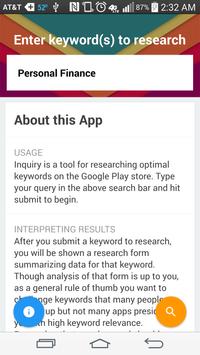 Inquiry is a keyword tool you can use for Google Play keyword research. We believe app store optimization (ASO) and proper keyword research is essential for ensuring quality products reach the appropriate customers. With our app store optimization (ASO) you can find top competitors and recieve traffic estimations for your apps.