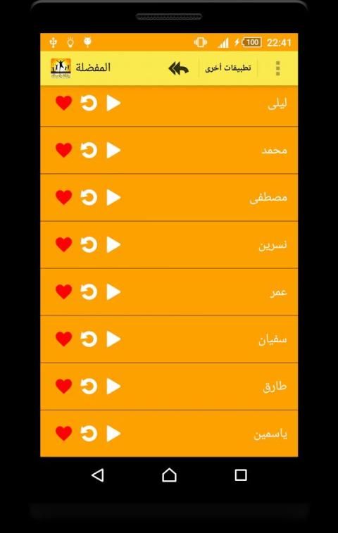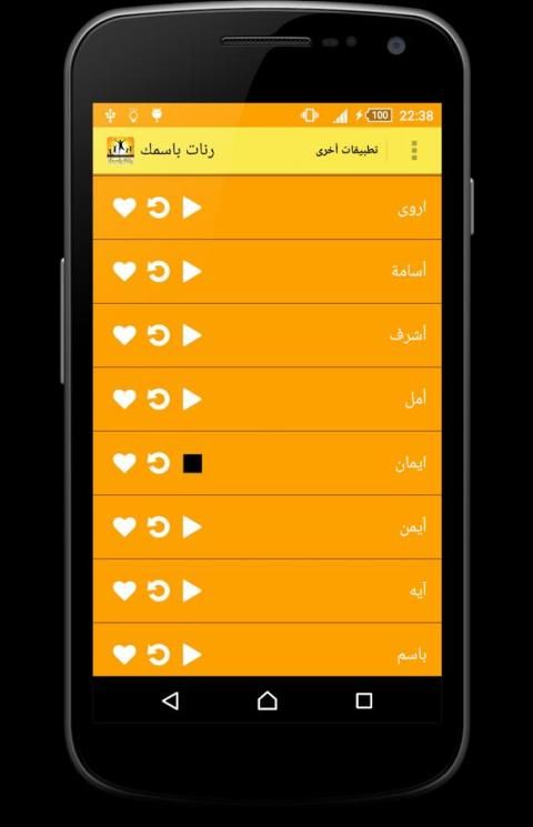يحتوي هذا اتلطبيق على رنات باسمك بدون انترنت، رنة باسم حضرتك، رنات جديدة وبجودة عالية اضافة إلى أنه يمكن جعلها رنة افتراضية للهاتف أو رنة افتراضية لمتصل ما، لا يحتوي هذا التطبيق على معاني للأسماء، فقط موسيقى تحتوي على اسم ما و مرتبة حسب الحروف، إضافة إلى خاصية جعل اي نغمة من النغمات فرنة للمنبه، العديد من الخاصيات الجديدة والجميلة تنتظرك في هذا التطبيق، أتمنى أن ينال إعجابكم
