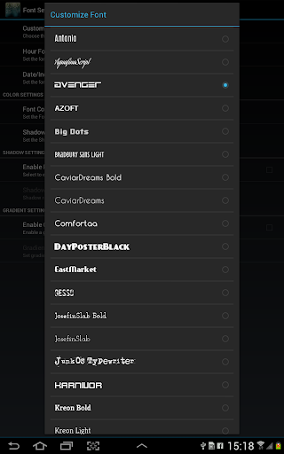 Super Clock Wallpaper memberikan anda jumlah yang luar biasa Tetapan penyesuaian: Anda boleh memohon lebih daripada 40 fon yang menakjubkan, tune penampilan font jam, warna (dengan transparansi) dan saiz; Anda boleh memohon bayang-bayang font dan juga kecerunan warna tersuai.