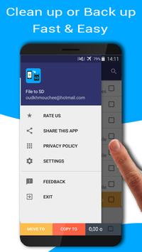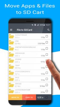Cette application "Files To SD Card" est utilisée pour transférer ou copier rapidement des fichiers depuis la mémoire interne sur la carte SD de votre téléphone. Avec ce programme, vous libérerez en un seul clic l´espace dans la mémoire interne du téléphone ou sauvegarderez des fichiers sur la carte SD.