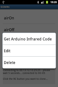 You can turn on/off air conditioner (any infrared controlled device) remotely, when you are out of home - just send SMS "click" to Android connected to Arduino with bluetooth HC-05 and infrared transmitter