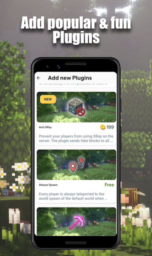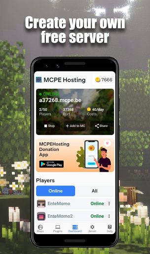 Aplikasi kami menyediakan perkhidmatan membuat pelayan untuk Minecraft Pocket Edition . boleh bermain terus dengan rakan anda. Satu dunia.Ini seperti dunia dengan banyak fungsi tambahan. Sudah tentu pemain lain juga boleh menyertai pelayan anda. .Jika tiada siapa yang berada di pelayan anda untuk masa yang lama, kami boleh mengalihkan pelayan anda ke bersedia.Anda boleh mulakan semula pada bila -bila masa dalam aplikasi. Pilih peta yang paling sesuai untuk pelayan anda peminat anda juga boleh memilih pelayan domain individu anda sendiri.Sudah tentu terdapat banyak tetapan lain juga.Kemudian aktifkan salah satu daripada banyak plugin kami untuk pelayan anda. Kami menawarkan, antara lain: kedudukan pemain, sistem wang, Worlddit & amp;Permainan mini seperti Skywars, 1vs1 & amp;SkyBlock