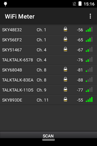 Untuk memulakan pengimbasan hanya tekan butang imbasan. Pengimbasan akan diteruskan secara berkala, tekan butang imbasan sekali lagi untuk berhenti. Tekan mana-mana item dalam senarai untuk maklumat lanjut. Gunakan menu Tetapan untuk menyesuaikan selang imbasan dan pembentangan hasilnya. Senarai rangkaian boleh dipaparkan dalam nama, saluran atau isyarat kekuatan isyarat dan boleh ditapis untuk memberi tumpuan kepada rangkaian terbuka sahaja dan / atau rangkaian pada saluran tertentu.