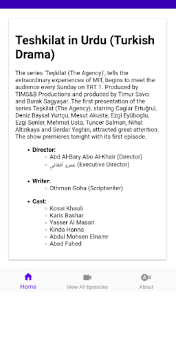 Aplikasi mudah alih ini adalah mengenai siri drama Turki yang terkenal "Teskilat" di Urdu.Teskilat akan menjadi pertunjukan Turki yang fundamental untuk menawarkan coretan data ke dalam komponen di dalam komponen Badan Perisikan Kebangsaan Turki yang disimpan misteri dan memanggil istana.Siri ini akan menyiasat pertempuran Bayar dan komitmen 7 Sekutu yang bertukar nyawa mereka untuk mendapatkan negara mereka dan dalam melakukan sebagai keperluan mereka telah menjadi tidak penting dari titik pandangan yang sahih yang tinggal di bawah tanah.