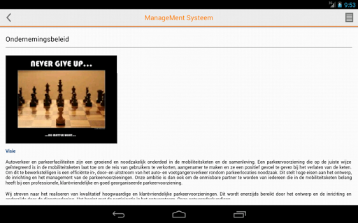 Met ManageMent Systeem Mobile kunt u altijd en overal over uw belangrijke documenten (protocollen, instructies, procedures etc.) beschikken om risico’s in het werk af te dekken. U kunt op een snelle en gebruikersvriendelijke wijze belangrijke documenten raadplegen. Het beheer via geprinte versies en overbodige beheersmatige (handmatige) handelingen wordt hiermee geëlimineerd.