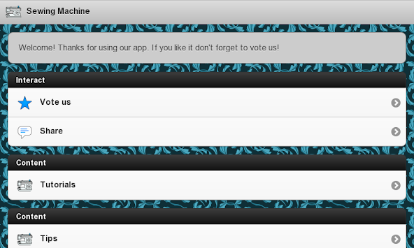 If you like to sew, you'll love the sewing machine, the application torque Android. If you are passionate about sewing, we invite you to learn how to use the sewing machine stitch with our selection of video tutorials. We have tutorials for the main sewing machines. Improve your technique with this application, and discover what's new, tips and patterns with us. It's free!