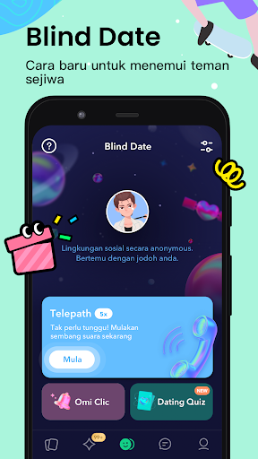 Terdapat lebih banyak cara untuk mendapatkan padanan selain daripada meleret. Omi Blind Date membantu anda bertemui orang yang mempunyai fikiran yang sama dalam cara yang kreatif. Bermula dengan memilih avatar! Anda boleh membuka kunci gambar sebenar padanan anda jika anda berdua menghantar 5 mesej.