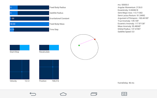 Kepler Orbit Simulator 2D is a processing for android app that allows the user to simulate a kepler orbit neglecting the mass of the orbiting body, defining their own values for relevant constants such as G as well as other parameters. These include simulation speed, the mass of the central body, and the orbital state vectors, velocity and position. The radius of the bodies being drawn can be adjusted for aesthetic purposes as well.