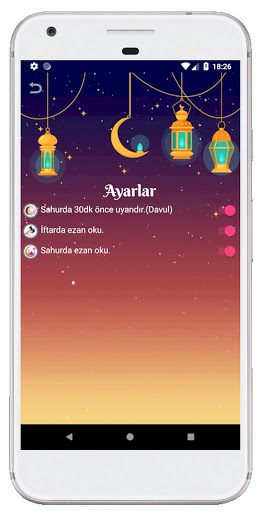 Ini akan membangunkan anda dengan bunyi gendang 30 minit sebelum sahur. Dan di Iftar membaca seruan untuk solat.