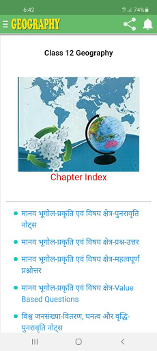 App contains solutions of all chapters of NCERT Geography for class 12. It contains some sample questions papers and chapter wise question answers also. This app has a very simple user interface.