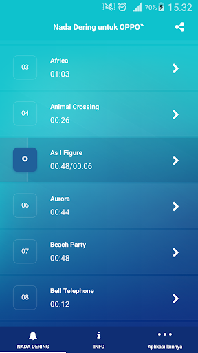 Semua bunyi yang digunakan dalam aplikasi nada dering untuk OPPO ™ adalah di bawah lesen biasa kreatif dan/atau domain awam.Untuk maklumat lanjut mengenai bunyi yang digunakan dalam permohonan, sila lawati permohonan mengenai permohonan dalam permohonan itu.Untuk pertanyaan atau aduan mengenai lesen, sila hubungi kami diringtonesultimate@gmail.com.