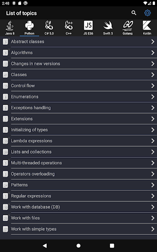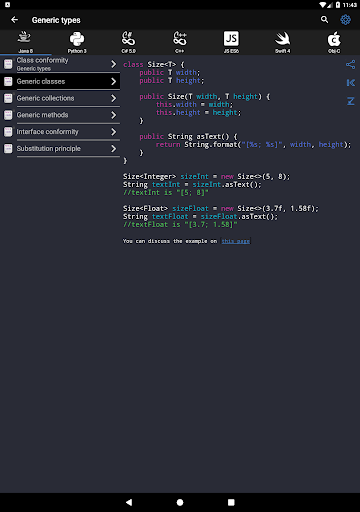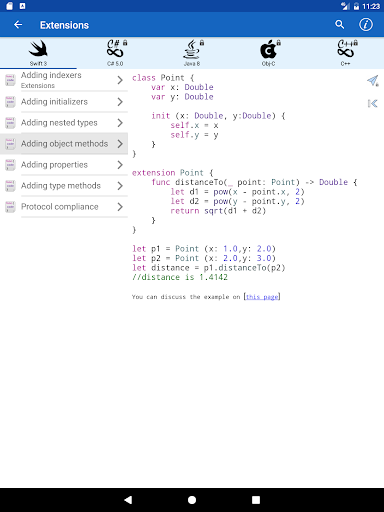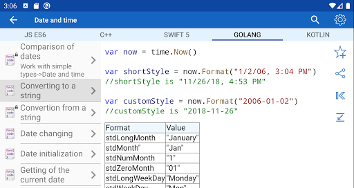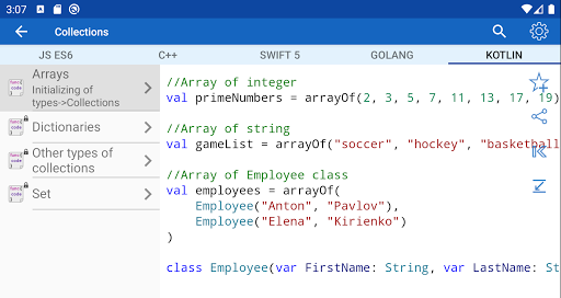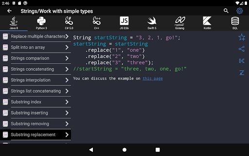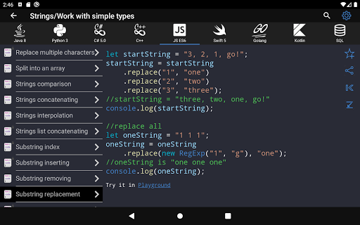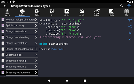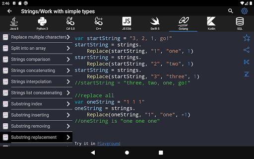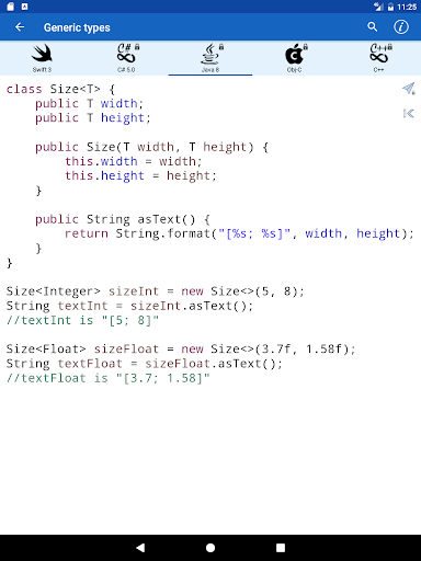 ✓ Sintaks Bahasa Pembelajaran pada Contoh Kod Khusus. Bagaimana untuk mendapatkan substring? Bagaimana untuk mengisytiharkan kaedah umum? Ini dan lebih daripada 250 sampel kod lain untuk setiap bahasa boleh didapati dalam aplikasi.