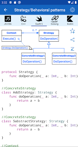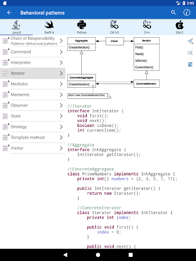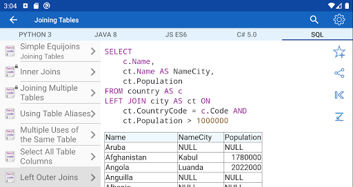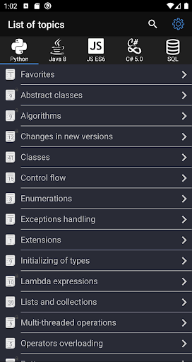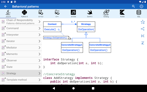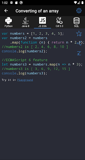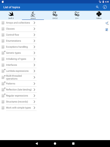 ✓ Aplikasi ini adalah alat yang baik semasa peperiksaan atau penyediaan untuk wawancara kerana ia mengandungi rujukan kepada operasi yang sering digunakan dalam bahasa pengaturcaraan yang berbeza.