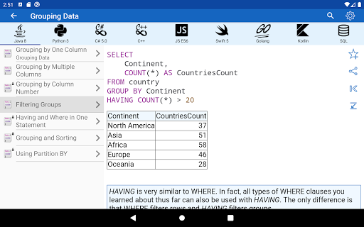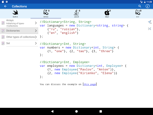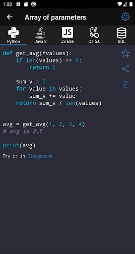 ✓ Anda tidak tahu bahasa pengaturcaraan mana yang hendak dipilih? Aplikasi ini boleh membandingkan sintaks dari setiap contoh dalam bahasa pengaturcaraan yang berbeza dan membuat keputusan yang seimbang semasa memilih bahasa pengaturcaraan.