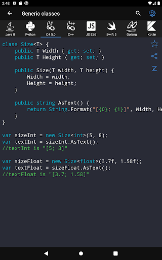 ✓ Ini adalah bantuan yang sangat baik bagi mereka yang sering menggunakan beberapa bahasa pengaturcaraan. Aplikasi ini mengurangkan masa yang diperlukan untuk beralih ke sintaks yang berbeza.