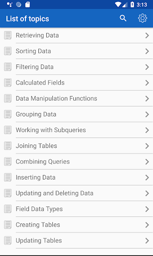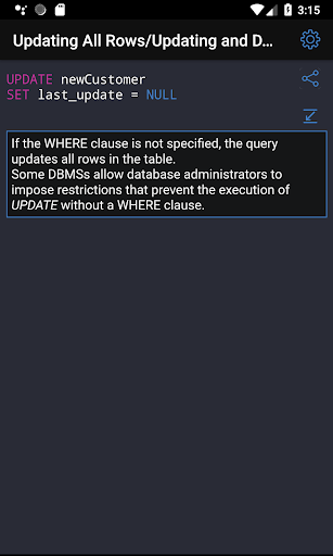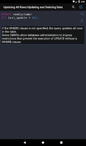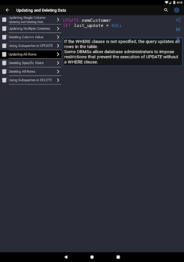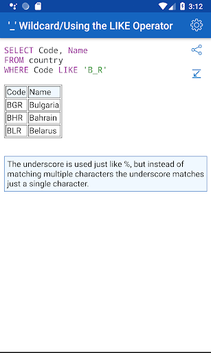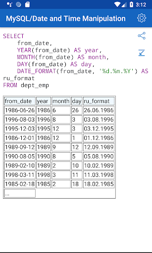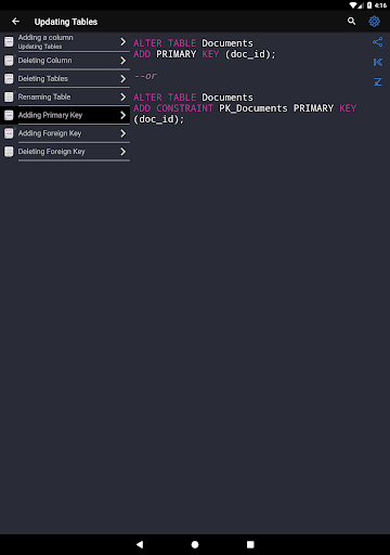 ✓ The application is a good tool during the exam or the preparation to the interview because it contains a reference to frequently used operations in SQL.