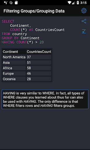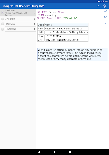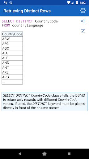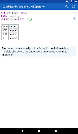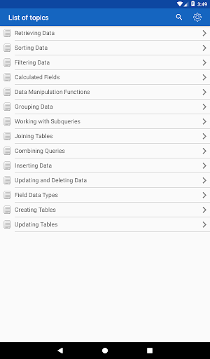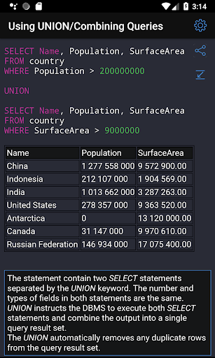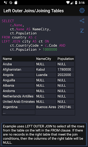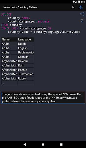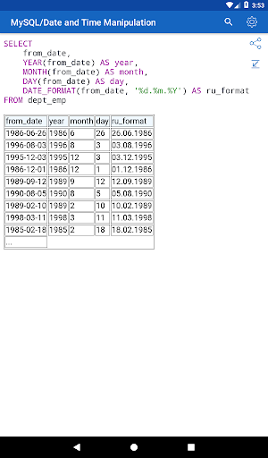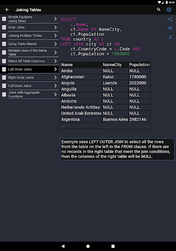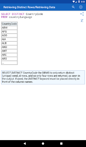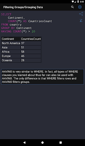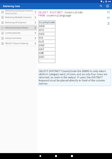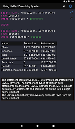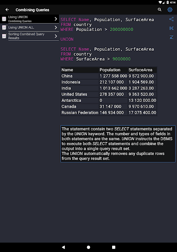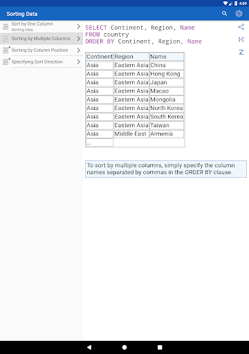 ✓ Learning SQL syntax on specific code examples. How to combine multiple tables in a single query? How to sort the result of grouping data? What types of data are there in SQL Server? These and over 150 of other code samples for SQL are available in the application.