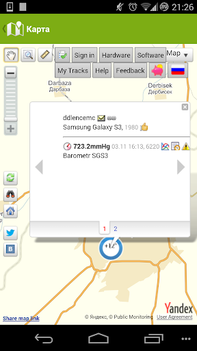 Seorang pemilihan aplikasi sensor pembacaan atmosfera luar dari telefon pintar anda (jika terdapat sensor dalam telefon pintar anda) dan memindahkannya ke pelayan "Pemantauan Rakyat" untuk dipaparkan di peta dunia.
