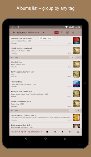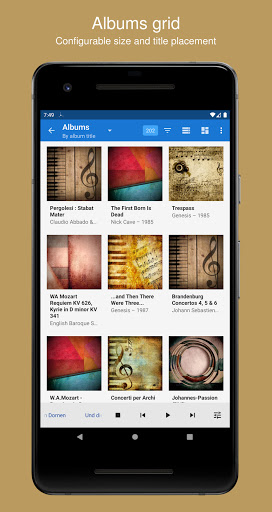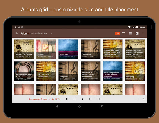 : Albums sebagai senarai atau sebagai grid, dan opsional Kumpulan mengikut tarikh, genre, artis, dan tag lain.