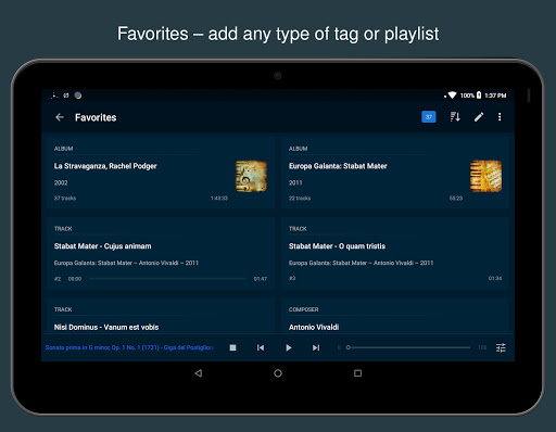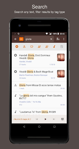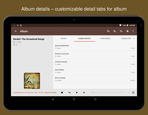 : Tajuk dipaparkan sepenuhnya walaupun dibungkus ke pelbagai baris yang hebat untuk muzik klasik dan aliran dalam talian dengan maklumat deskriptif mengenai trek bermain.