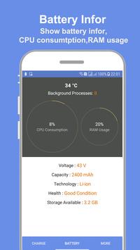 - Battery information: CPU consumption (%),RAM usage (%),voltage,background processes,capacity,healthy,storage available,technology, temperature(°F,°C),...