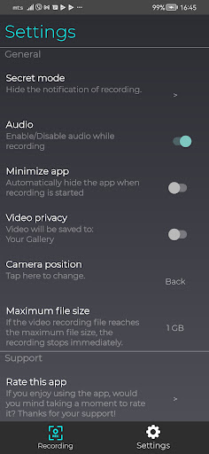 • Menyimpan video ke penyimpanan fail dalaman Android.> • Sembunyikan aplikasi secara automatik semasa rakaman dimulakan.