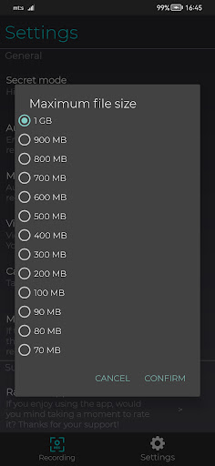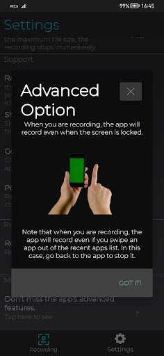 Max File Size = 1 TB . When you are recording, the app will record even when the screen is locked. Note that when you are recording, the app will record even if you swipe an app out of the recent apps list. In this case, go back to the app to stop it.